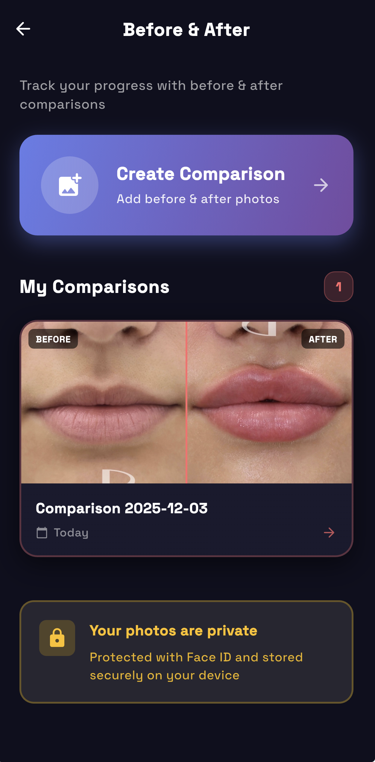Your treatment history and photos stay private on your device. Optional Face ID or PIN protection keeps your aesthetic journey confidential.